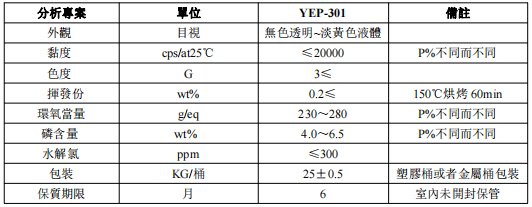 YEP-301系列系無(wú)溶劑、低粘(zhan)度、高磷含(hán)量含磷液(yè)態環氧樹(shu)脂,和(he)一般環氧(yǎng)樹脂類似(si),適合(hé)配合各種(zhong)各類的環(huan)氧樹脂固(gù)化劑、促進(jìn)劑、填料(不(bú)推薦碳酸(suan)鹽類)、輔料(liào)以及各種(zhǒng)溫度下的(de)固化反應(ying),製造各種(zhǒng)各類的無(wú)鹵阻燃環(huan)氧樹脂產(chan)品。